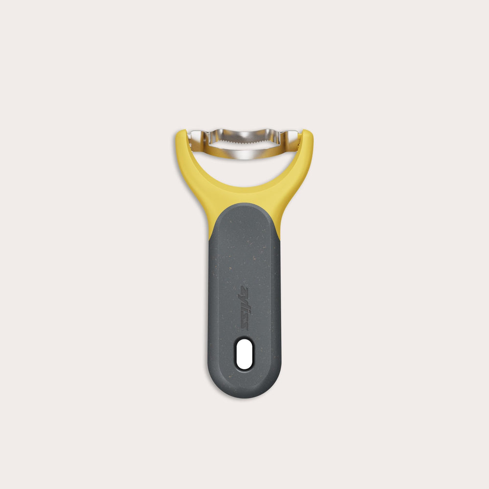 Upgrade your kitchen tools with the Zyliss Y Peeler, designed for the versatile peeling of fruits and vegetables. Its ergonomic handle, crafted from sustainable wheat straw material, reduces plastic usage by up to 50% and provides a comfortable grip. The precision stainless steel swivel blade ensures smooth, efficient peeling, while the handy side eye cutter easily removes blemishes. With a durable blade guard for added safety and the convenience of being food-safe and dishwasher-safe, this peeler combines sustainability with superior performance for your every day kitchen needs.