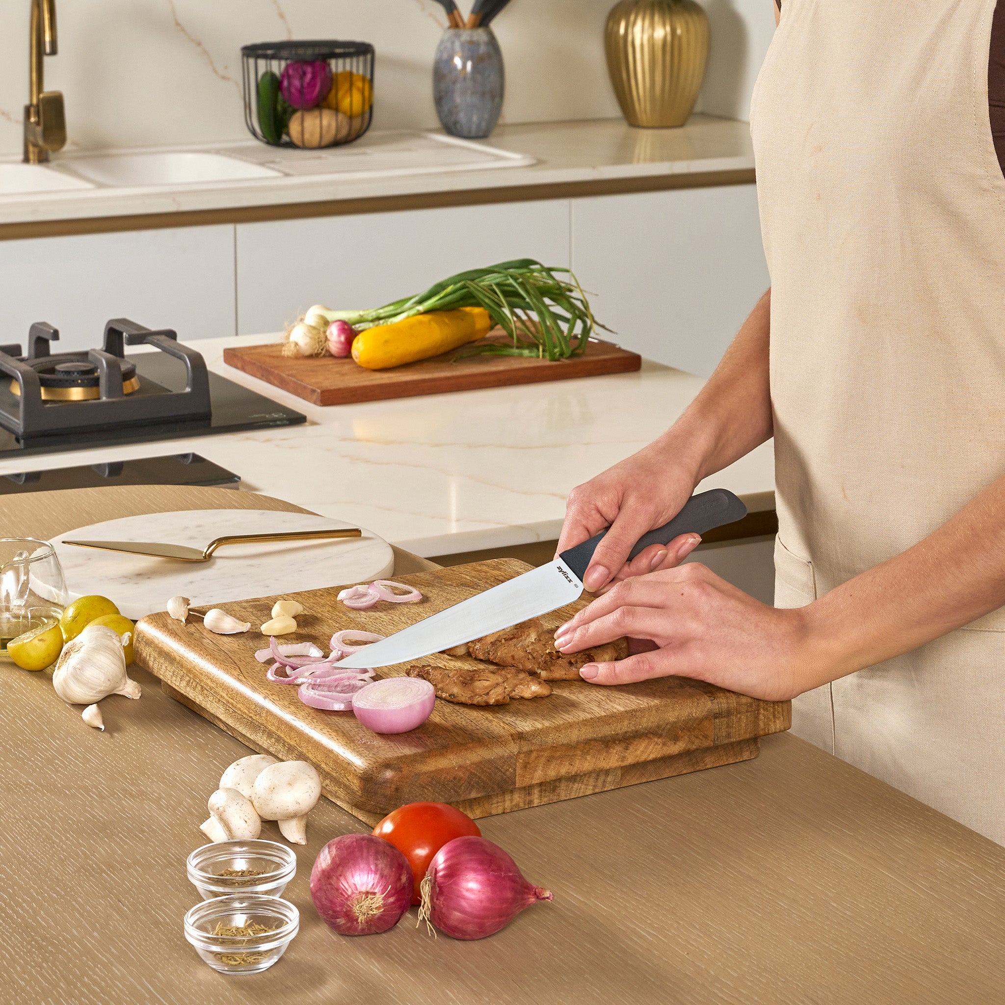 The Zyliss Carving Knife is designed for smooth, precise slicing of roasts, poultry, and large cuts of meat. Its long, narrow stainless steel blade glides through cooked meats with minimal resistance, delivering clean, even slices every time. The ergonomic handle, made with sustainable wheat straw, offers control and comfort while reducing plastic use by up to 20%. Ideal for both everyday meals and special occasions, this carving knife is backed by a 5-year Zyliss guarantee for lasting performance.