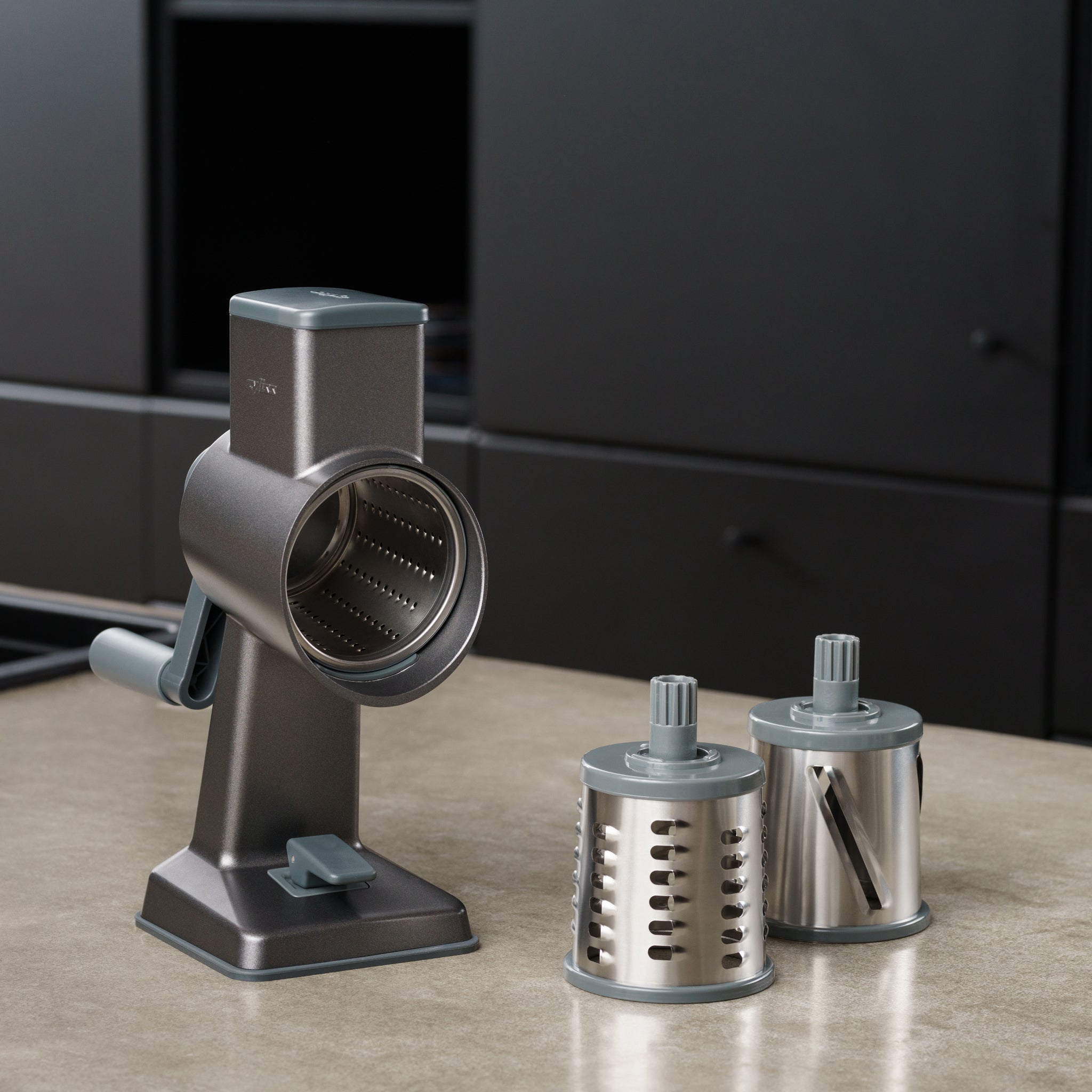 • The Zyliss Gourmet Drum Grater Set rests on the counter, ready to shred fresh carrots, with stainless steel drums gleaming against sleek black cabinets.