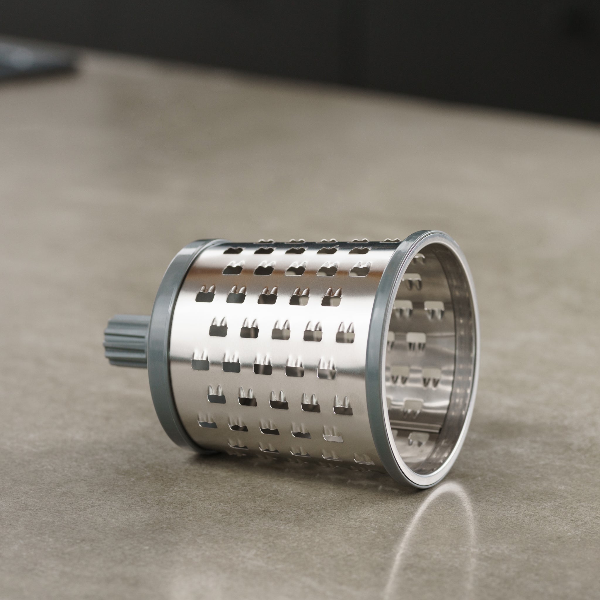 Versatile stainless steel drum suitable for grating cheese, chocolate, nuts, and vegetables with ease.