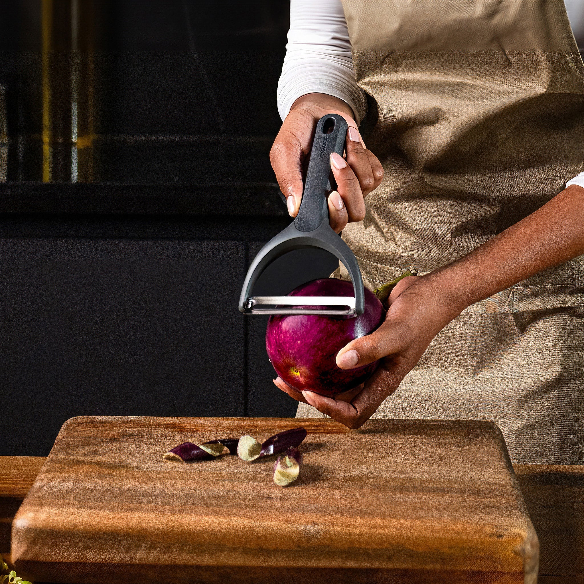 Tackle tough vegetables effortlessly with the Zyliss Wide Peeler. Its extra-wide stainless steel blade effortlessly peels through thick-skinned produce like eggplant, while the sharp point effortlessly removes imperfections. The ergonomic, eco-friendly wheatstraw handle ensures comfortable use, reducing plastic use by up to 50%. Built to last, this peeler is food-safe, dishwasher-safe, and features a durable blade guard. Backed by a 5-year guarantee, this Wide Peeler seamlessly combines sustainability and performance for a smarter, greener kitchen.