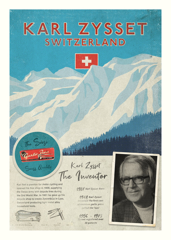 For over 70 years, Zyliss has been at the heart of kitchens worldwide, transforming everyday cooking with clever, innovative tools. But our story begins in Switzerland with one man: Karl Zysset. A true pioneer, Karl combined technical expertise with a passion for problem-solving, creating kitchen gadgets that make cooking easy and fun. From the world’s first cast aluminum garlic press to iconic inventions like the zick zick food chopper, his legacy of innovation lives on.