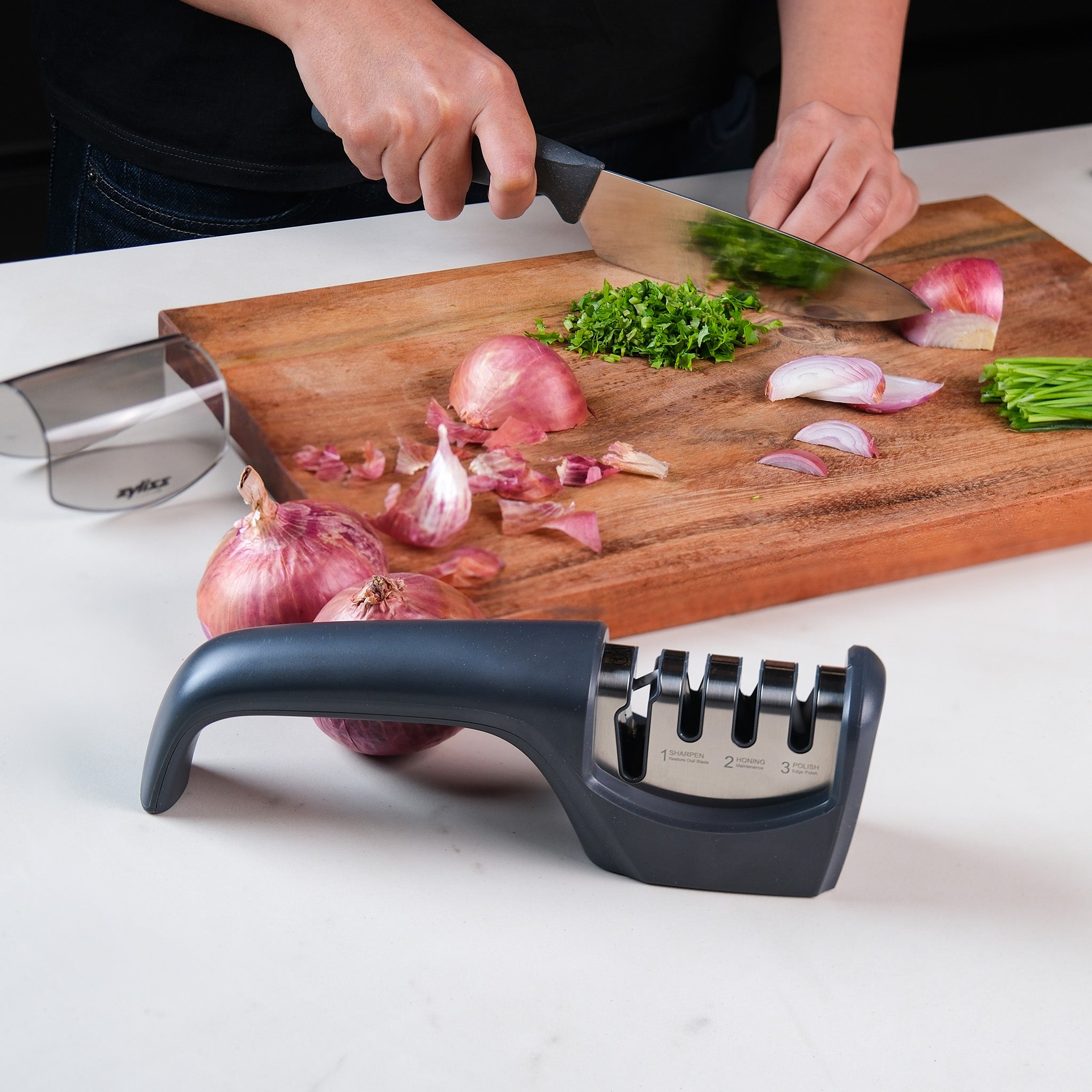 The Zyliss 4-in-1 Knife Sharpener is the essential tool for keeping your kitchen blades in top condition. With dedicated slots for sharpening, honing, polishing, and serrated edge care, it restores performance and prolongs the life of your knives and scissors. The ergonomic handle is crafted from 15% wheat straw material to reduce virgin plastic. A non-slip base keeps the tool steady during use, while its compact shape makes storage simple. Suitable for all straight edge knives, most serrated blades, and kitchen scissors. for keeping your kitchen blades in top condition. With dedicated slots for sharpening, honing, polishing, and serrated edge care, it restores performance and prolongs the life of your knives and scissors. A non-slip base keeps the tool steady during use, while its compact shape makes storage simple. Suitable for all straight edge knives, most serrated blades, and kitchen scissors.