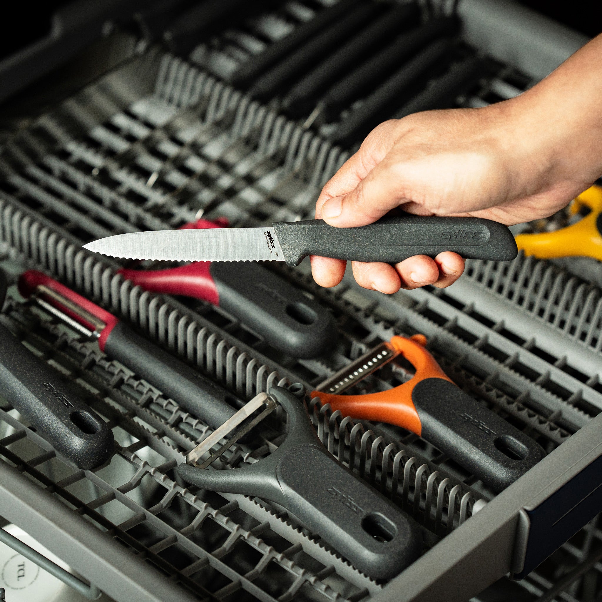 Elevate your knife techniques with the Zyliss Serrated Paring Knife, expertly crafted for precision in small cutting and dicing tasks. Its serrated blade effortlessly slices through tough vegetables and fruits, ensuring seamless kitchen performance. Dishwasher safe and complete with a convenient blade guard for safe storage. This knife features an ergonomic handle design using an eco-friendly wheat straw material, reducing plastic usage by up to 20%. Backed by a 5-year Zyliss guarantee, it's the perfect blend of functionality, sustainability, and durability for your kitchen essentials.