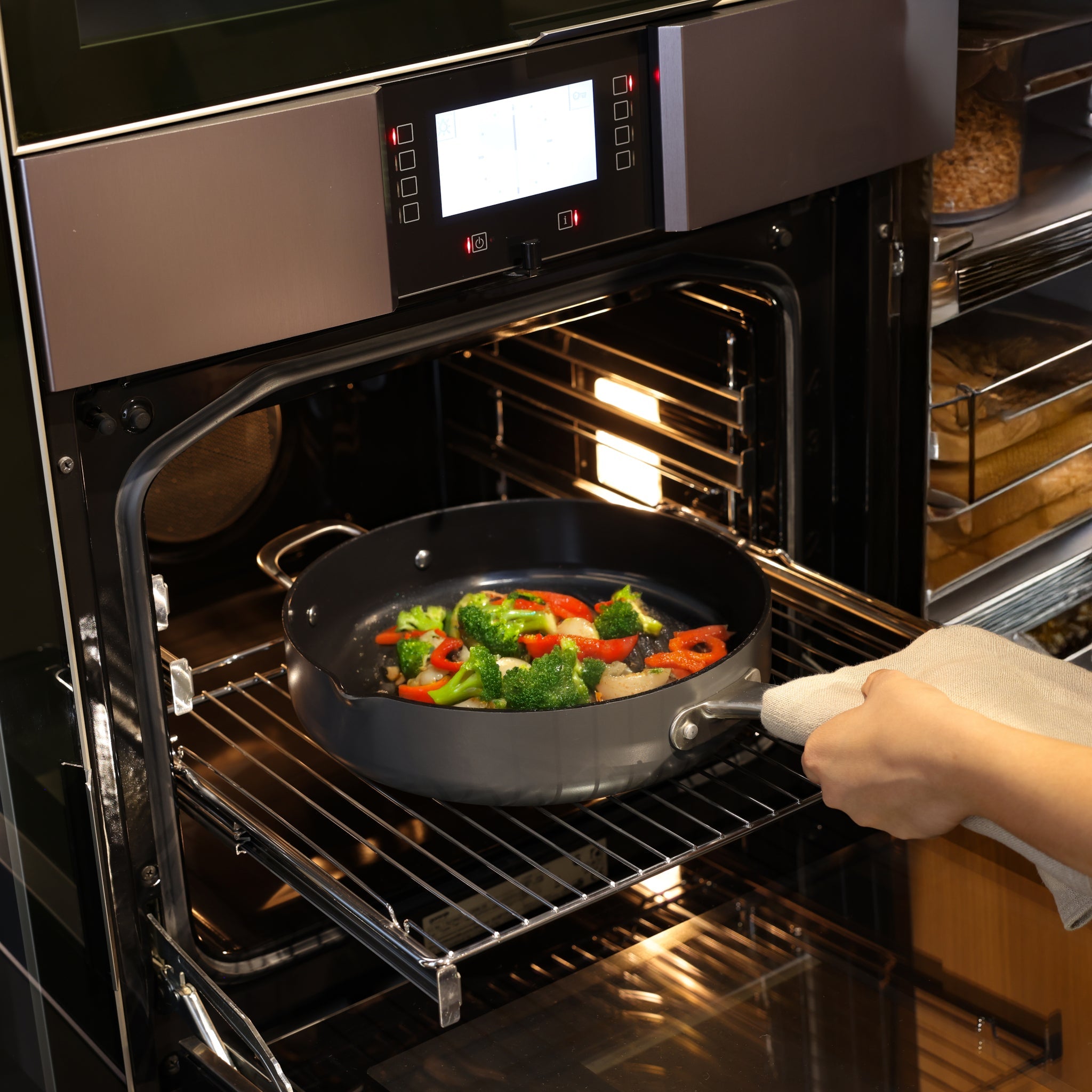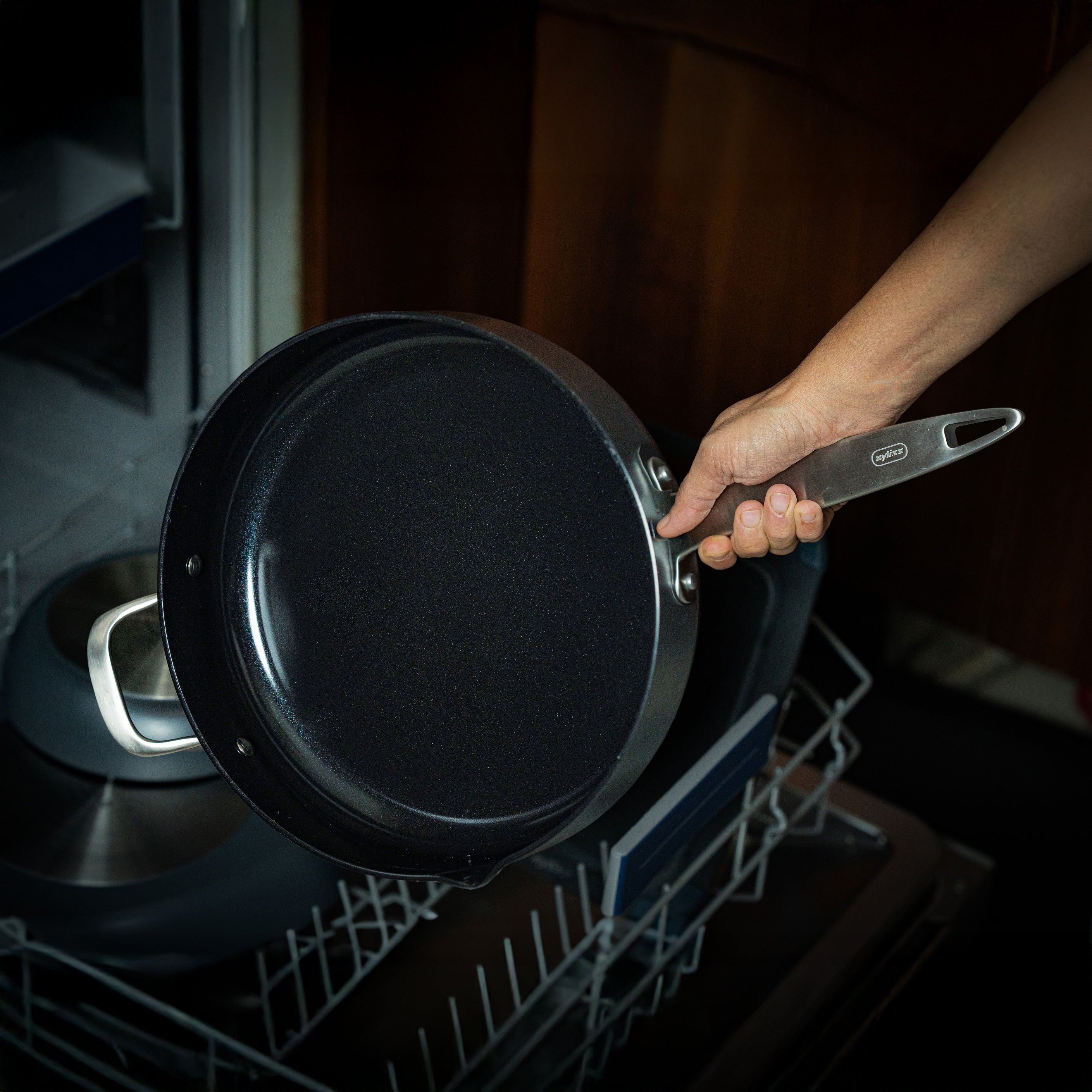 Introducing the Zyliss Ultimate Pro Ceramic Sauté Pan with Lid, 28cm / 11". Perfect for handling large cooking tasks—ideal for whipping up flavorful stir-fries, searing tender meats, or simmering sauces for the whole family. Our toughest-ever ceramic non-stick coating ensures effortless food release and quick cleanup, while the recycled aluminium body with a stainless steel base delivers fast, even heating. Complete with a glass lid for monitoring cooking progress and a convenient pour spout, this pan is food-safe, dishwasher and oven-safe up to 220°C / 430°F. Backed by a 10-year Zyliss guarantee and compatible with all hobs, this versatile pan is a must-have for any kitchen.