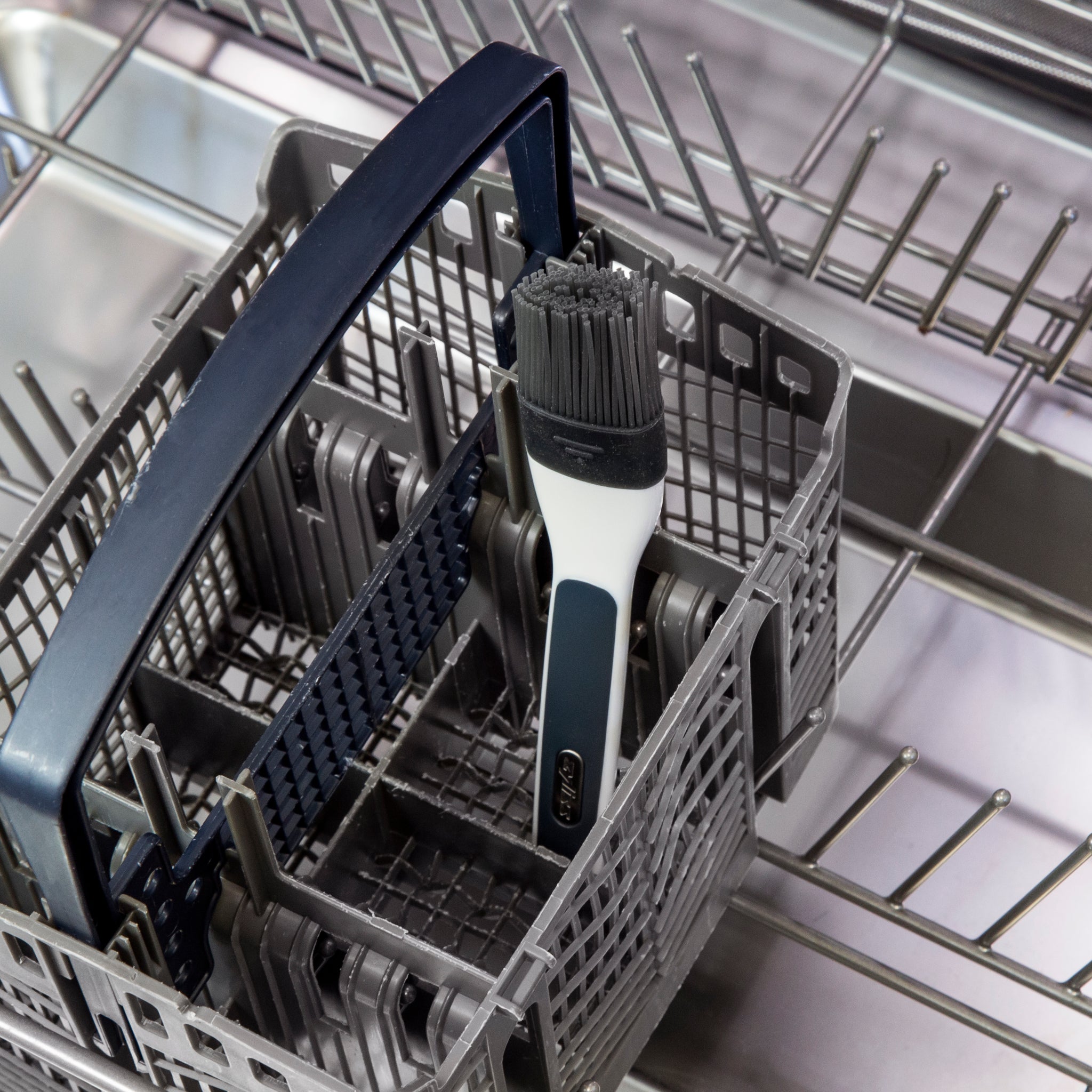 • The Zyliss Silicone Pastry Brush, available in black and white, features a long handle with a hanging hole and is dishwasher safe for easy cleaning.